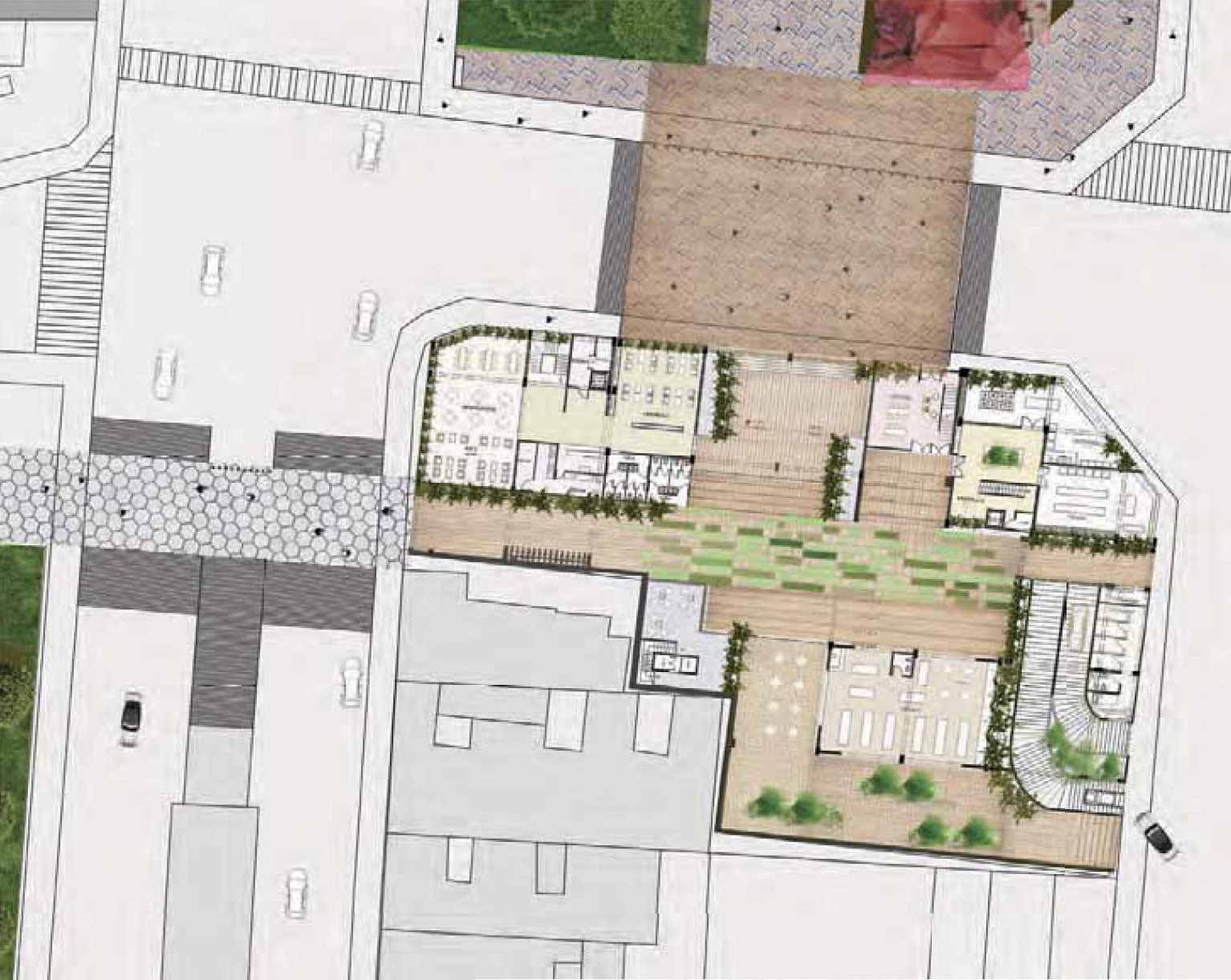 El conjunto esta diseñado para generar una extensión del parque que tiene al frente, esto se logra mediante el tratamiento de pavimentos en el parque y en el conjunto.